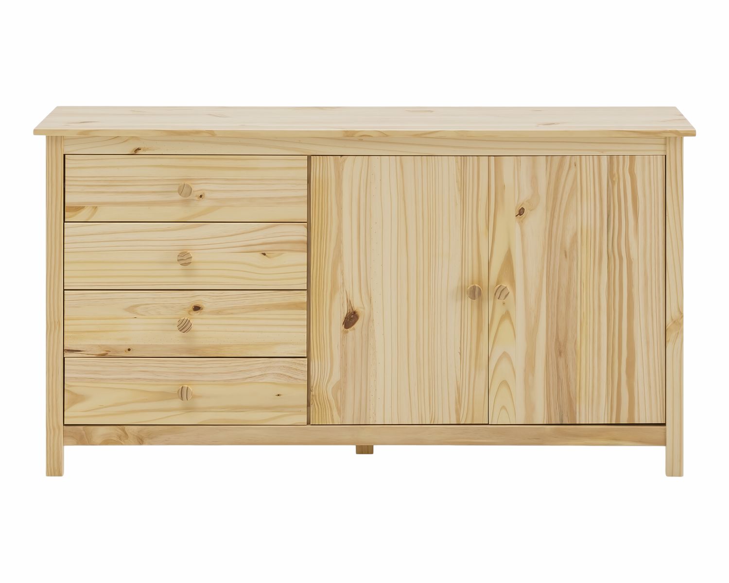 Diese zeitlose und moderne Kommode ist aus massivem Kiefernholz gefertigt und die Oberflächen sind zum Schutz lackiert. Viel Stauraum und Platz befindet sich in 4 Schubladen mit Metallauszug und hinter 2 Türen mit einem Regalboden. Ein sehr funktionales Möbelstück, das nicht nur vielseitig verwendbar, sondern auch sehr hochwertig und solide ist. Ideal zum Beispiel für ein Studentenzimmer.