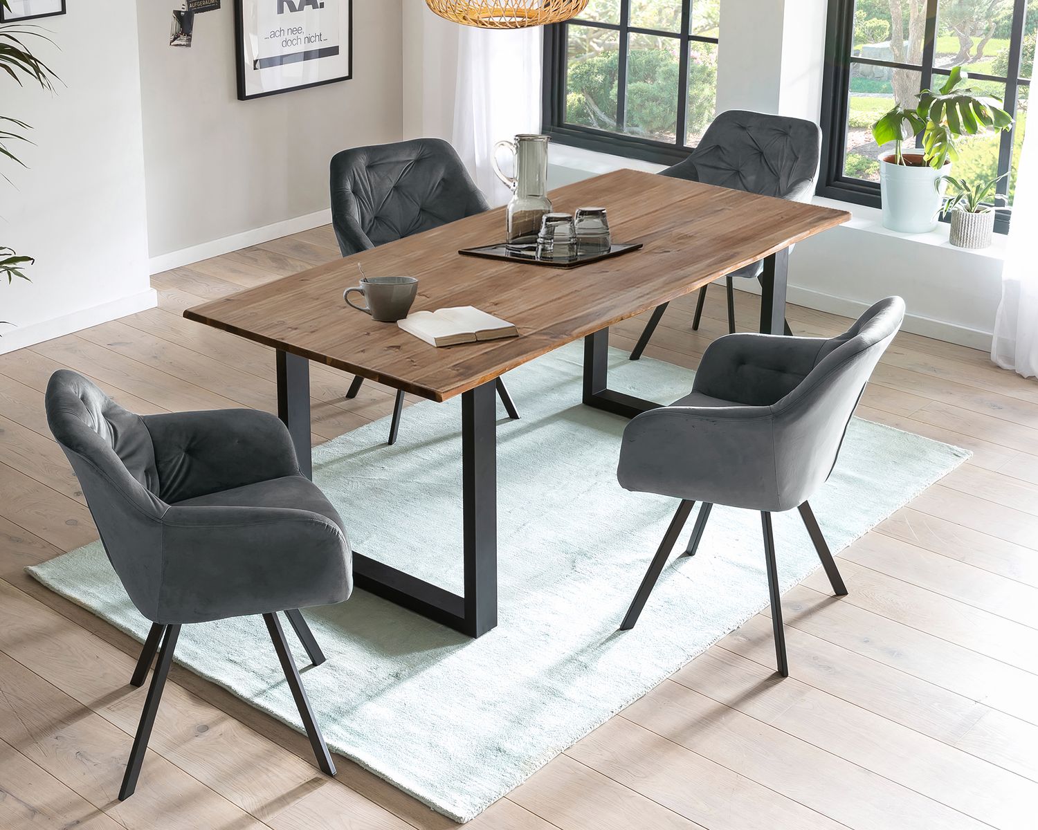 Vintage-Flair mit glamourösem Touch: Die 5-teilige Essgruppe »Layne-Fiona« besteht aus einem Tisch aus massiver Akazie, sowie 4 Armlehnstühlen mit edlem Samt-Bezug.